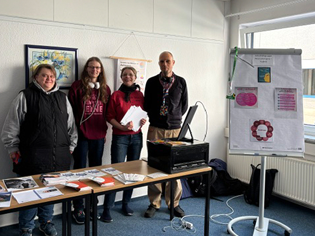 Im Anschluss blieb ausreichend Zeit, um beim „Markt der Möglichkeiten“ einen der Infostände zu besuchen. So zeigte die „Selbsthilfegruppe Neurodivergenz“ auf, welchen Hürden Menschen mit einer Neurodivergenz im Alltag begegnen. „Wir nehmen unsere Umwelt und uns selbst einfach anders wahr“, sagte Fabian. „Und da ist es ein gutes Gefühl zu wissen, dass man nicht allein ist.“ Der Autismusverband Mecklenburg-Vorpommern und das ABFZ mit den beiden Sitzen Schwerin und Rostock informierte über die verschiedenen Angebote. Sehr beeindruckend war auch die Ausstellung der Werke von Künstlerinnen und Künstlern aus dem Autismus-Spektrum.